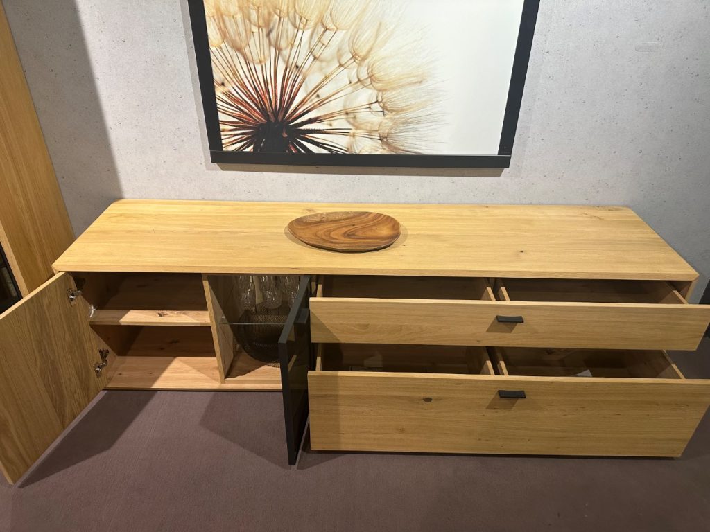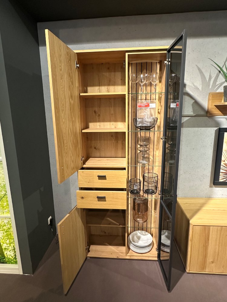 BemerkungAnbauwand in Eiche furniert und Schwarzglas, Maße: B/H/T: ca 300x208 x51 cm, Inkl. Beleuchtung, ohne Dekoration! Entdecken Sie das beeindruckende Modell Interliving 2024 von INTERLIVING, eine Ausstellungware, die durch ihre exzellente Verarbeitung und ihr modernes Design überzeugt. Diese exklusive Möbelstück vereint Funktionalität mit Stil und bringt frischen Wind in Ihr Zuhause. Hergestellt mit höchster Präzision und aus hochwertigen Materialien, steht das Interliving 2024 Modell für Langlebigkeit und eine zeitlose Ästhetik, die sich harmonisch in jede Wohnumgebung einfügt. Die durchdachte Konstruktion bietet ausreichend Stauraum, während die klaren Linien und das elegante Finish einen Hauch von Luxus verleihen. Ein Muss für alle, die auf der Suche nach einem perfekten Zusammenspiel von Komfort und zeitgemäßem Design sind. Ob als zentrales Element im Wohnbereich oder als eleganter Blickfang, dieses Modell setzt neue Maßstäbe in Sachen Wohnqualität. Verleihen Sie Ihrem Zuhause mit der Interliving 2024 Kollektion einen Hauch von Exklusivität und erleben Sie Möbelkunst auf höchstem Niveau.