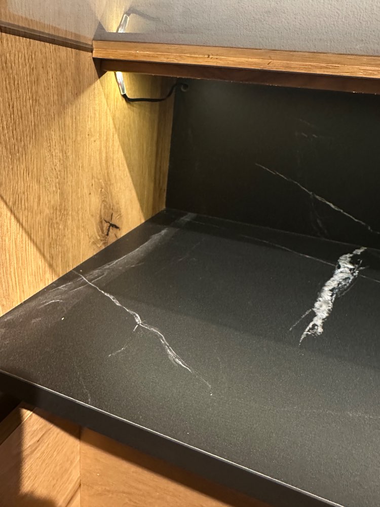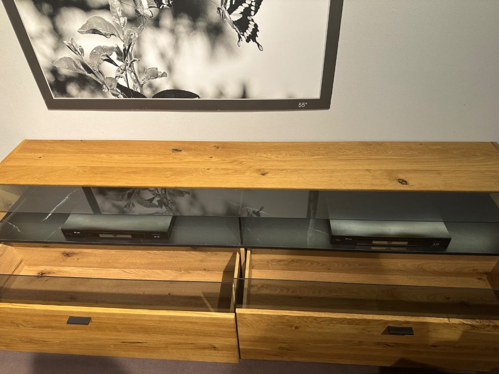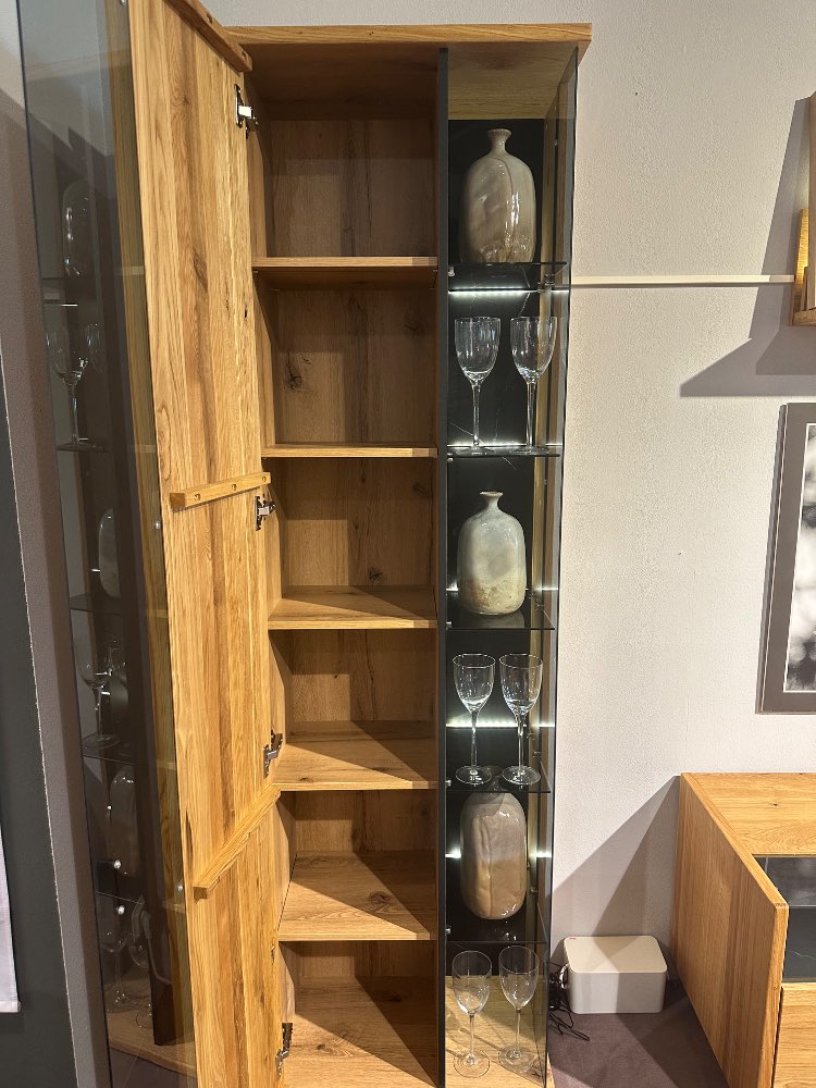 Bemerkung Wohnwand bestehend aus: 1x Vitrine B/H/T ca. 60x209x50 cm, 1x Lowboard, ca. B 216 cm, 1x Wandboard, ca. B 180 cm, gesamt Kombination ca. B/H/T ca.286x209x50cm, inklusive folgendem Zubehör: 1x Beleuchtung, zeitloses Design mit hoher Funktionalität, ausreichend Stauraum, sorgt in jedem Raum für ein stilvolles Ambiente durch Holz in Asteiche mit Absetzungen in grau Mamoroptik und Glasböden, Glastüren aus Parsolglas, Ohne Dekoration!