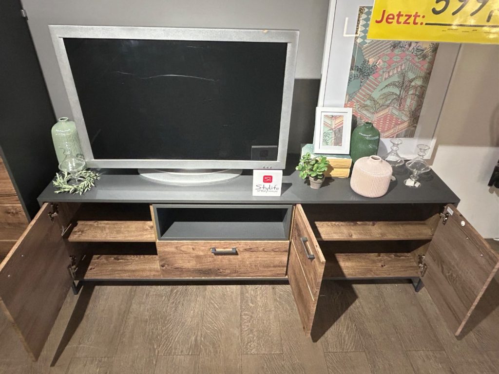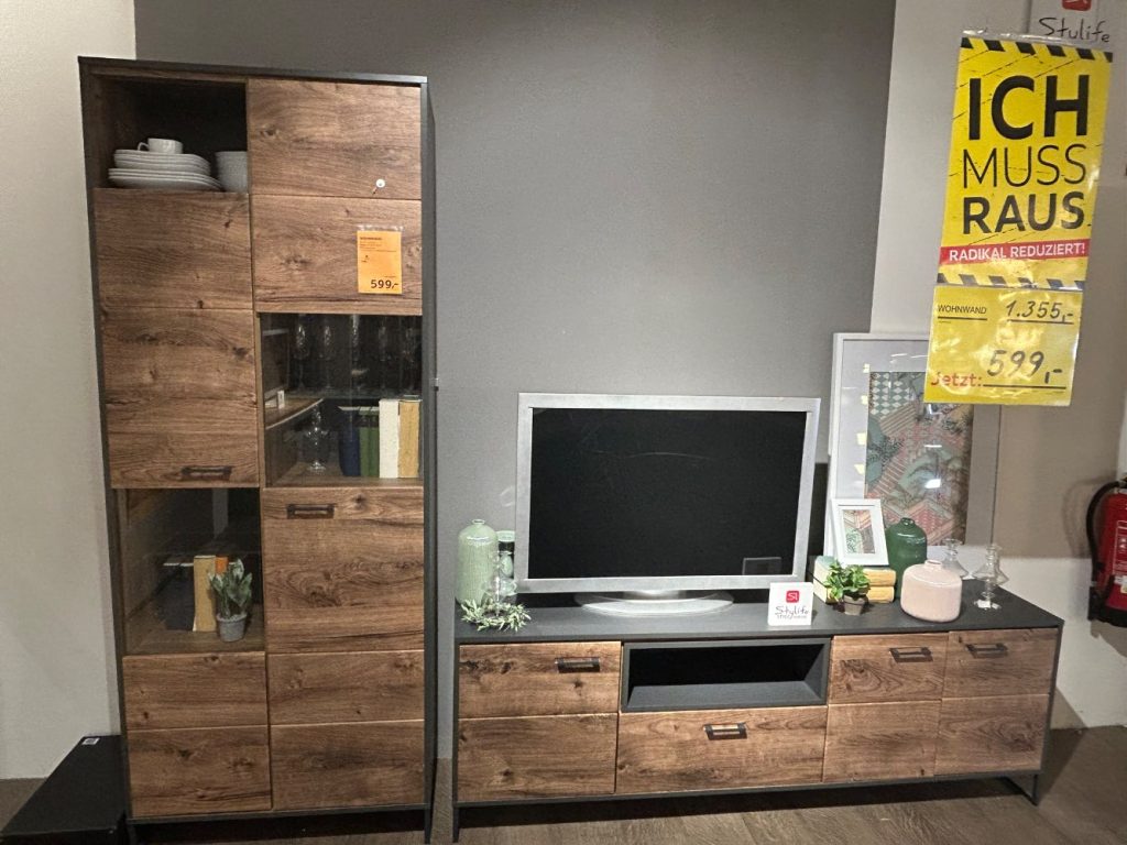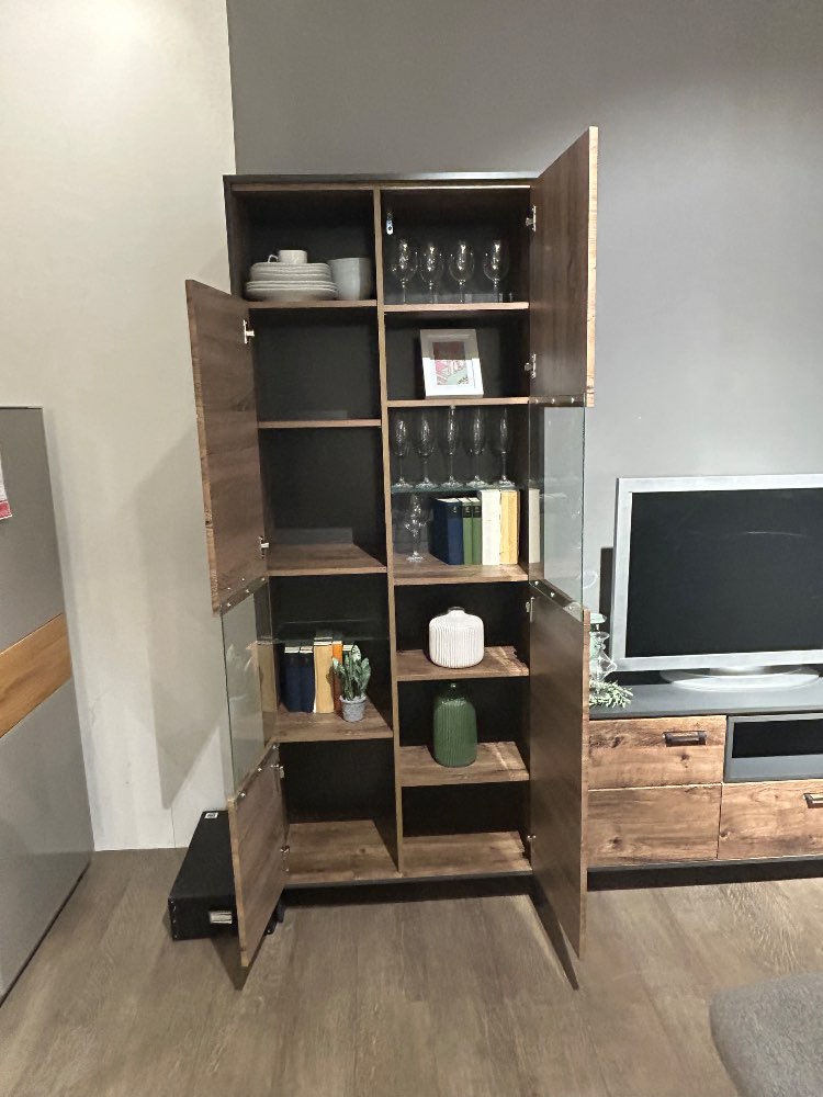 B / H / T: 259 x 203 x 43 cm Wohnwand bestehend aus: Lowboard / 1937003402 B / H / T: 180 x 61 x 43 cm > Füße - Form: Kufe - Farbe: Graphit > Griffe - Art: Bügelgriff - Farbe: Graphit > Türen - Art: Drehtür - Anzahl: 3 - Türdämpfung: Ja > Einlegeböden - Anzahl: 2 - Max. Belastbarkeit pro Boden: 5 kg > Schubladen - Anzahl: 1 - Soft-Close-System: Ja Vitrine / 1937003401 B / H / T: 79 x 203 x 43 cm > Füße - Form: Kufe - Farbe: Graphit > Griffe - Art: Bügelgriff - Farbe: Graphit > Türen - Art: Drehtür - Anzahl: 2 - Türdämpfung: Ja > Einlegeböden - Anzahl: 6 - Max. Belastbarkeit pro Boden: 2 kg Farben: Eiche / Graphit