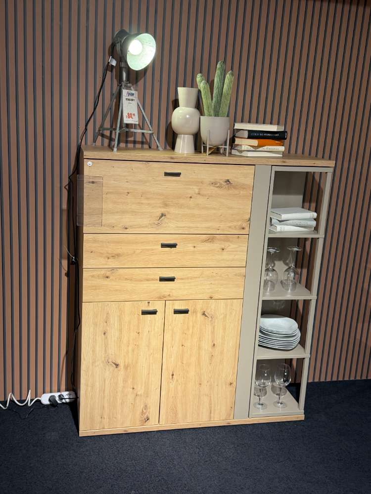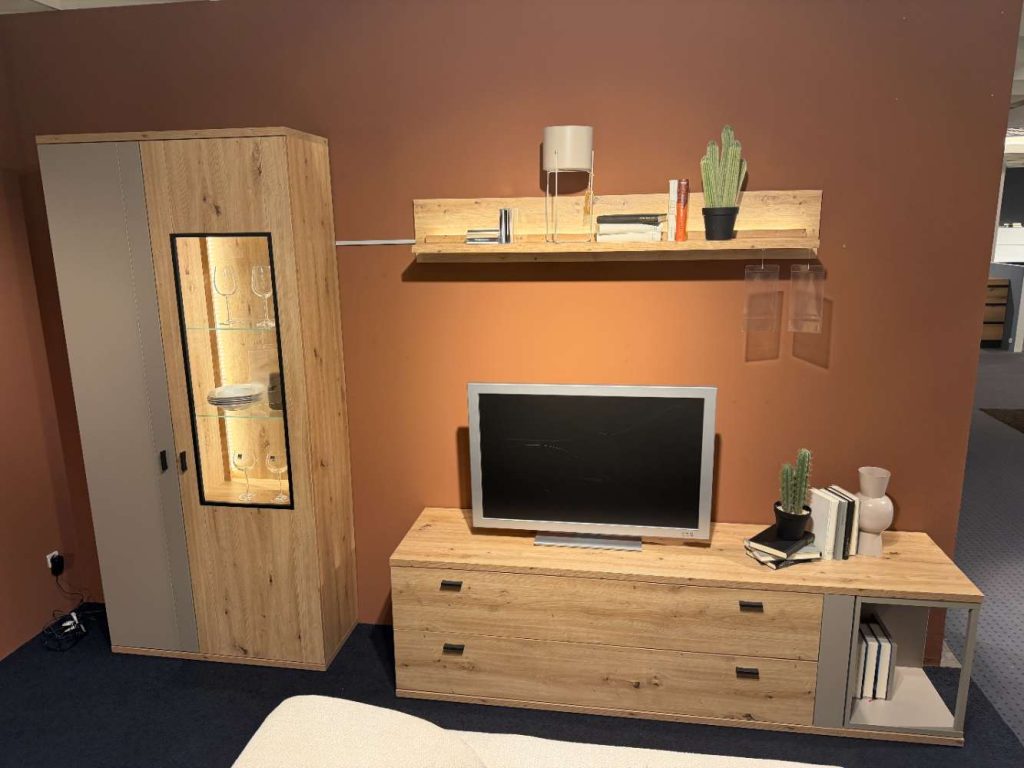 Die Wohnwand in Eiche Artisan vereint Eleganz und Funktionalität in einem zeitlosen Design und wird als Ausstellungsware angeboten. Mit Maßen von ca. 303x208x48 cm bietet sie großzügigen Platz für Ihre Unterhaltungselektronik und Dekorationen. Das Set beinhaltet ein stilvolles Highboard, das mit den Abmessungen von ca. 120x141x40 cm zusätzlichen Stauraum schafft. Die natürliche Maserung der Eiche verleiht jedem Raum eine warme und einladende Atmosphäre. Das integrierte Beleuchtungssystem setzt Ihre Dekorationen und Sammlerstücke gekonnt in Szene, wodurch die Wohnwand nicht nur funktional, sondern auch ein dekorativer Blickfang wird. Egal ob für Bücher, Vasen oder persönliche Erinnerungsstücke – dieses Ensemble bietet reichlich Stauraum und hebt Ihr Wohnambiente auf ein neues Niveau. Perfekt für alle, die ein harmonisches und modernes Wohngefühl schaffen möchten.