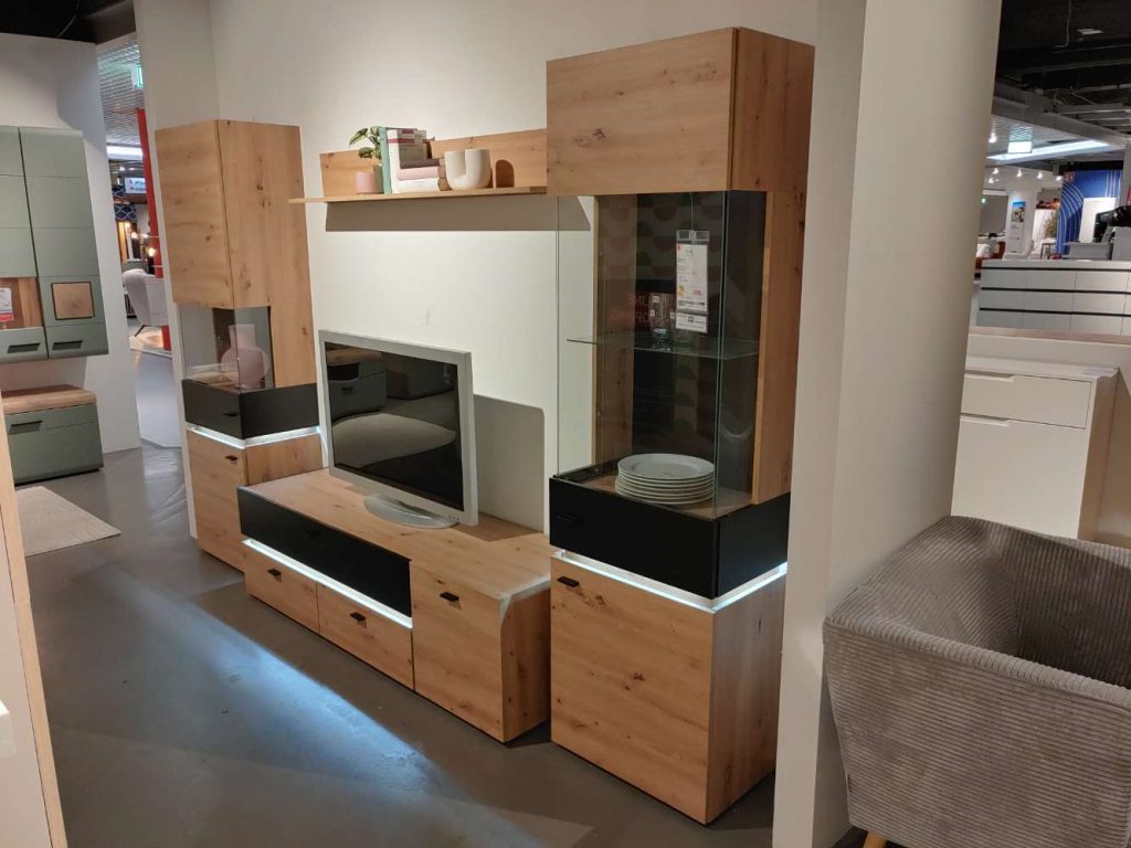 BemerkungDer Wohnzimmerschrank Marcus beeindruckt durch seine zeitgemäße Kombination aus Funktionalität und Stil. In einer eleganten Eiche Artisan Nachbildung gehalten, erzeugt er eine warme und einladende Atmosphäre, die durch schwarze Akzente geschmackvoll unterstrichen wird. Hergestellt aus hochwertiger Spanplatte, bietet er mit seinen großzügigen Maßen von ca. 310 cm in der Breite, 191 cm in der Höhe und 47 cm in der Tiefe ausreichend Platz für Ihre Lieblingsstücke. Die robusten schwarzen Kunststofffüße sorgen für Stabilität und harmonieren perfekt mit den schwarzen Absetzungen des Möbels.