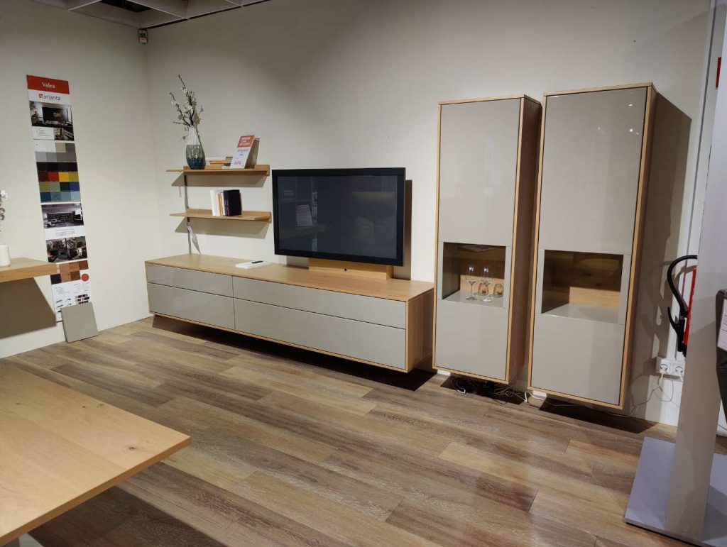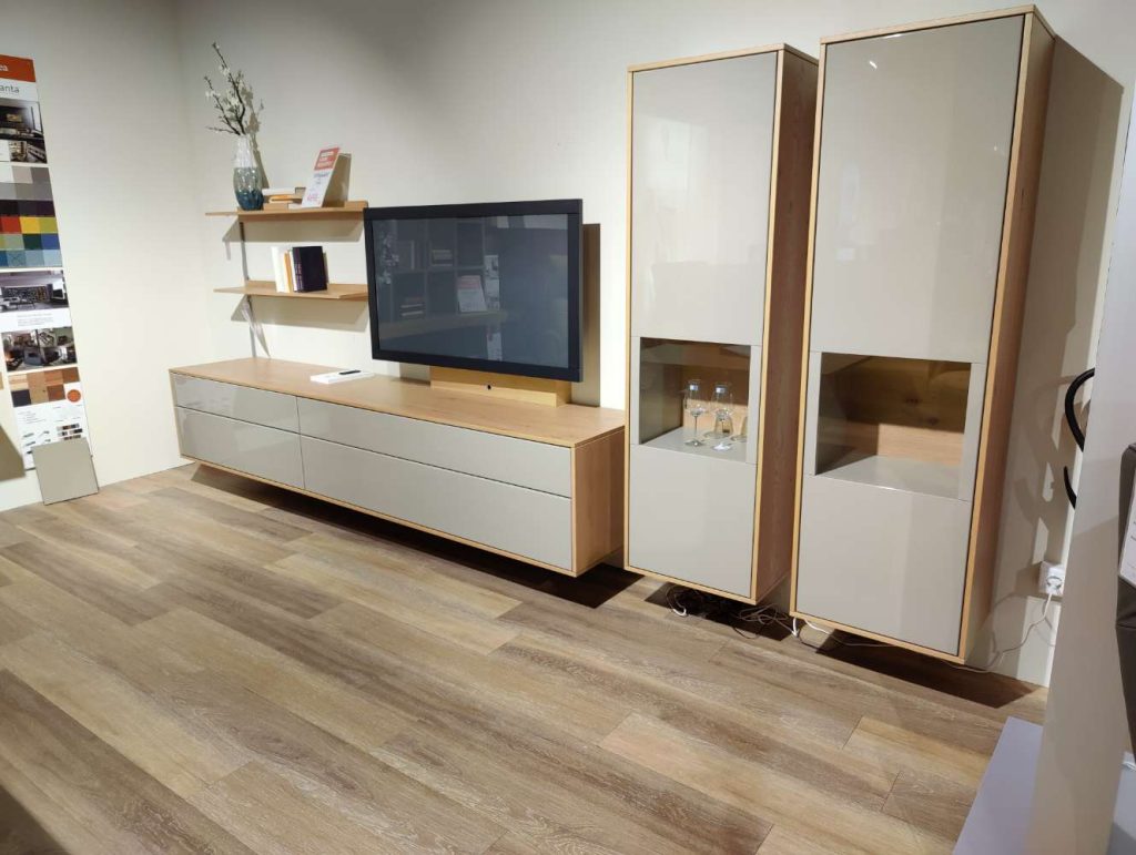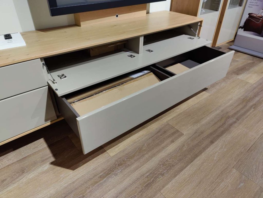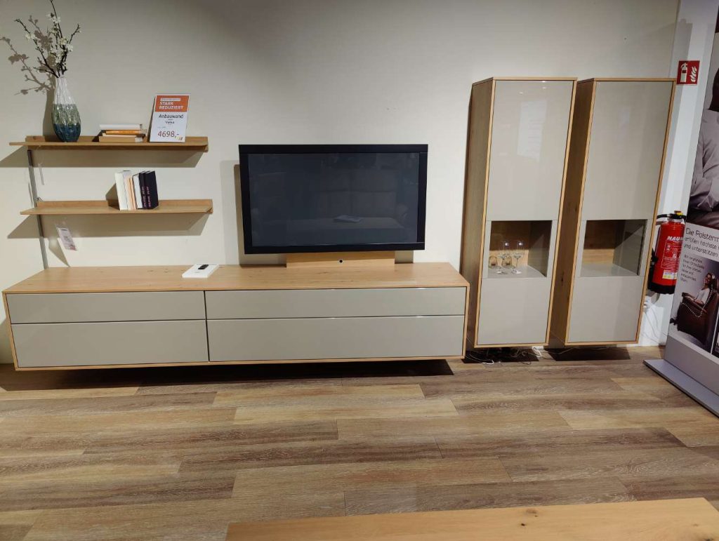 BemerkungDie Wohnwand Valea von RMW vereint Raffinesse und Funktionalität in einem eleganten Design, das in jedem Wohnzimmer zum Blickfang wird. Gefertigt aus hochwertigem Holzwerkstoff, besticht diese Ausstellungware durch ihre exquisite Lackoberfläche in der Farbe Cashmere, gepaart mit natürlichen Akzenten aus Asteiche. Die Hochglanzfront verleiht der Wohnwand eine moderne und luxuriöse Anmutung, die den Raum in ein stilvolles Ambiente taucht.