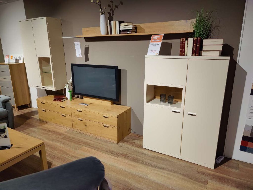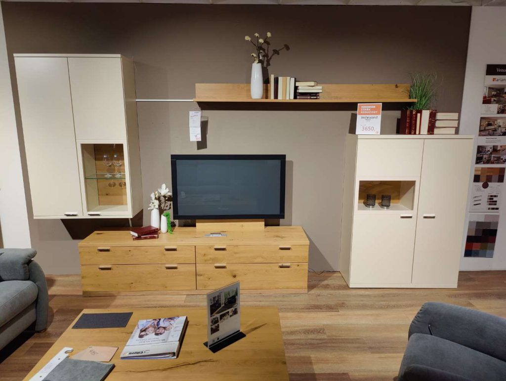 BemerkungDie Wohnwand Venue von RMW verkörpert zeitlose Eleganz und höchste Qualität, die in jedem Detail zum Ausdruck kommt. Gefertigt in Deutschland, überzeugt dieses ebenso praktische wie stilvolle Möbelstück mit seiner harmonischen Farbkombination aus Lack Crema und Asteiche. Das edle Holzwerkstoff-Material verleiht der Wohnwand nicht nur eine robuste Stabilität, sondern sorgt auch für ein modernes und dennoch gemütliches Ambiente. Mit den beeindruckenden Maßen von 360 x 222 x 49,2 cm bietet sie großzügigen Stauraum und Präsentationsfläche, um Ihr Wohnzimmer optimal zu gestalten.