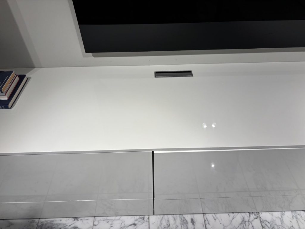 zeitlose moderne Anbauwand in Lack weiß hochglanz / Absetzung Eiche Melamin inklusive Kabeldurchlass fürs Lowboard