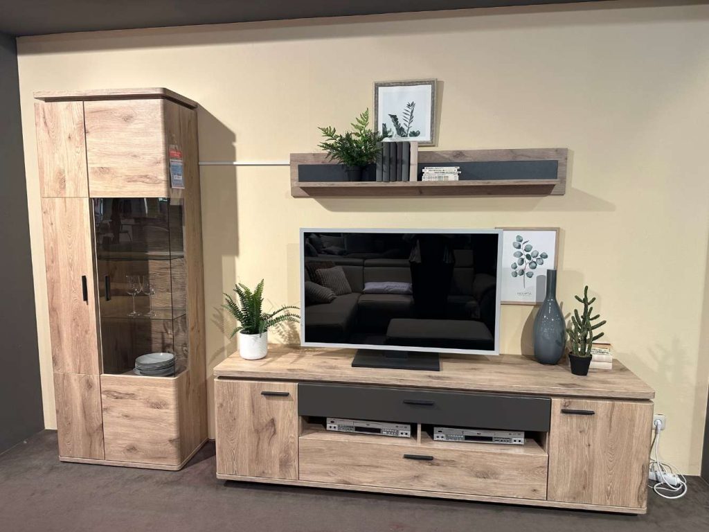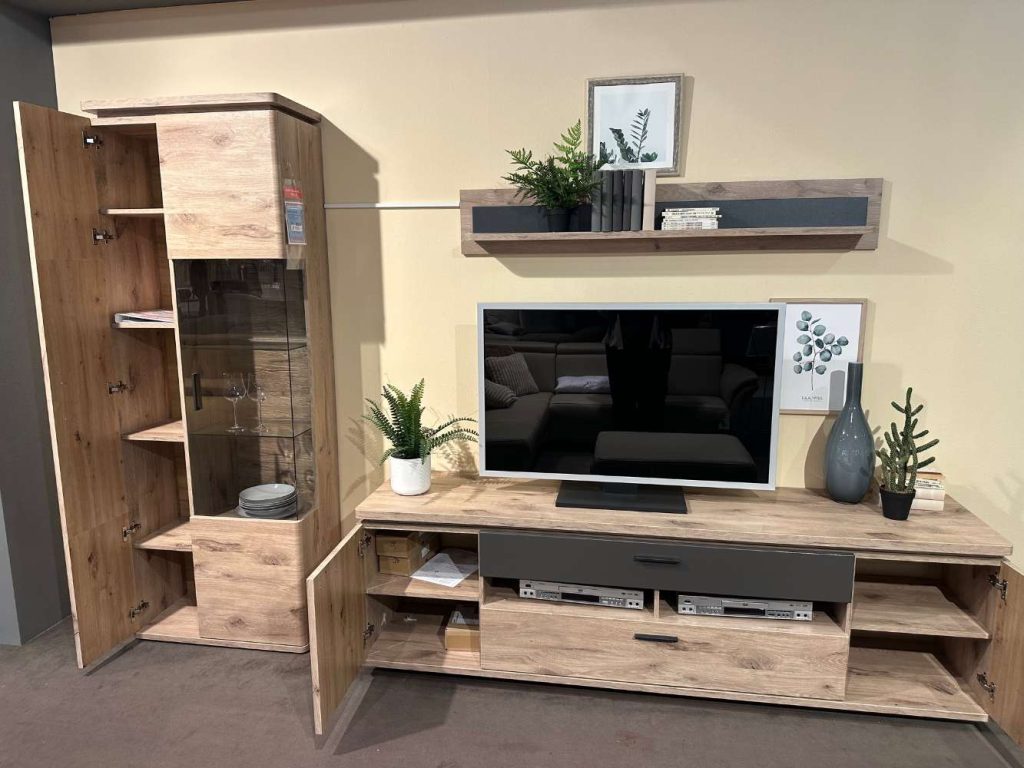 Bemerkung Entdecken Sie mit dem Modell Modena von MCA ein Möbelstück, das Eleganz und Funktionalität in perfekter Harmonie vereint. In der stilvoll kontrastierenden Farbe Viking Oak präsentiert sich diese Ausstellungware als wahrer Blickfang und verleiht jedem Wohnzimmer eine zeitgemäße Ästhetik. Die großzügigen Maße von circa 295 x 208 x 50 cm bieten ausreichend Platz für all Ihre multimedialen Geräte und mehr. Ein besonderes Highlight ist die beeindruckende Vitrine mit einer Glastür, die Ihre Lieblingsstücke stilvoll zur Schau stellt. Das TV-Element bietet mit zwei Türen, zwei Schubladen und zwei offenen Fächern ausreichend Stauraum. Zusätzlich besticht das Wandboard mit Paneel und Boden, das Ihre Wände geschickt ausnutzt. Für das perfekte Ambiente sorgt die integrierte LED-Beleuchtung, bestehend aus einer zweifachen Rückwandbeleuchtung und einem LED-Band, komplett mit Trafo und moderner Funkfernbedienung. Dank der Memory- und Dimmfunktion lässt sich die Beleuchtung individuell nach Ihren Wünschen anpassen. Mit dem Modell Modena von MCA holen Sie sich ein Stück moderne Wohnkultur in Ihr Zuhause.
