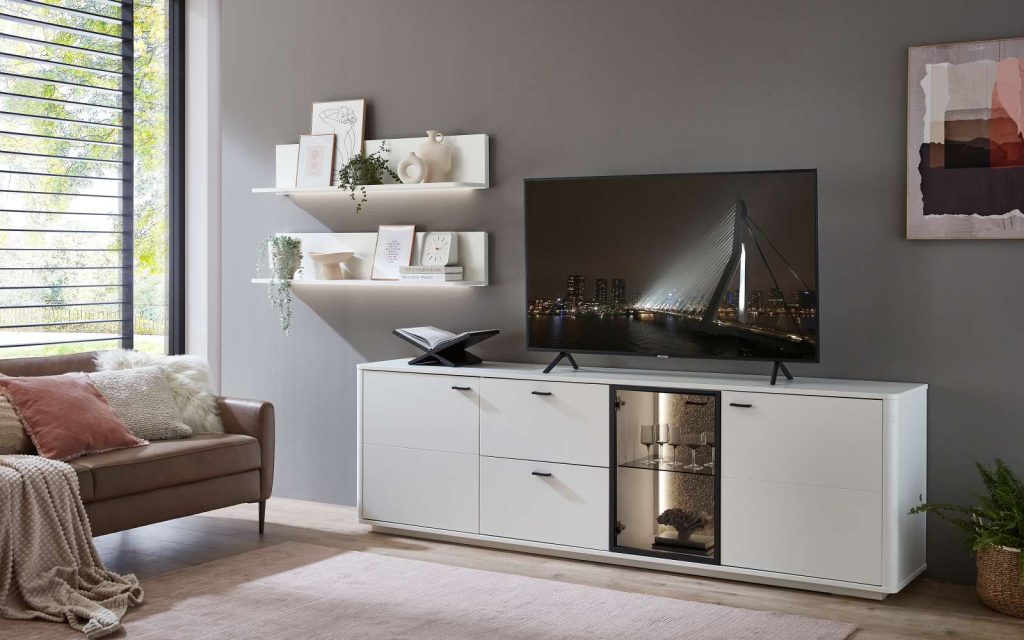 BemerkungModerne Wohnwand mit Front und Korpus in Weiß lackiert, Rückwand aus elegantem Kristallstein, Lowboard mit 2 Holztüren, 1 Glastür, 2 Schubkästen, 2 Holzeinlegeböden, 1 Glaseinlegeboden, inklusive Unterflurführung und Dämpfung, Griffe aus Metall in Schwarz, 2x Wandboard mit 1 Paneel und 1 Holzboden, viel Platz für eine individuelle Dekorierung, ein Highlight in jedem Wohnzimmer, ohne Beleuchtung, B/H/T ca. 282 x 169,6 x 43,8 cm.