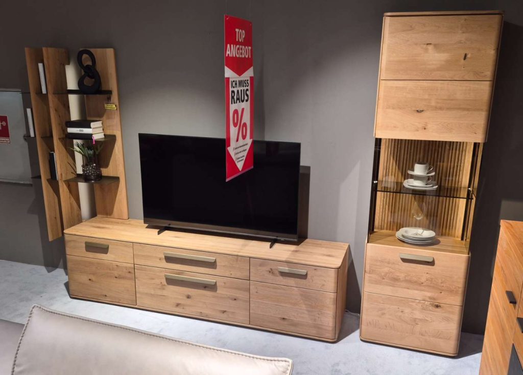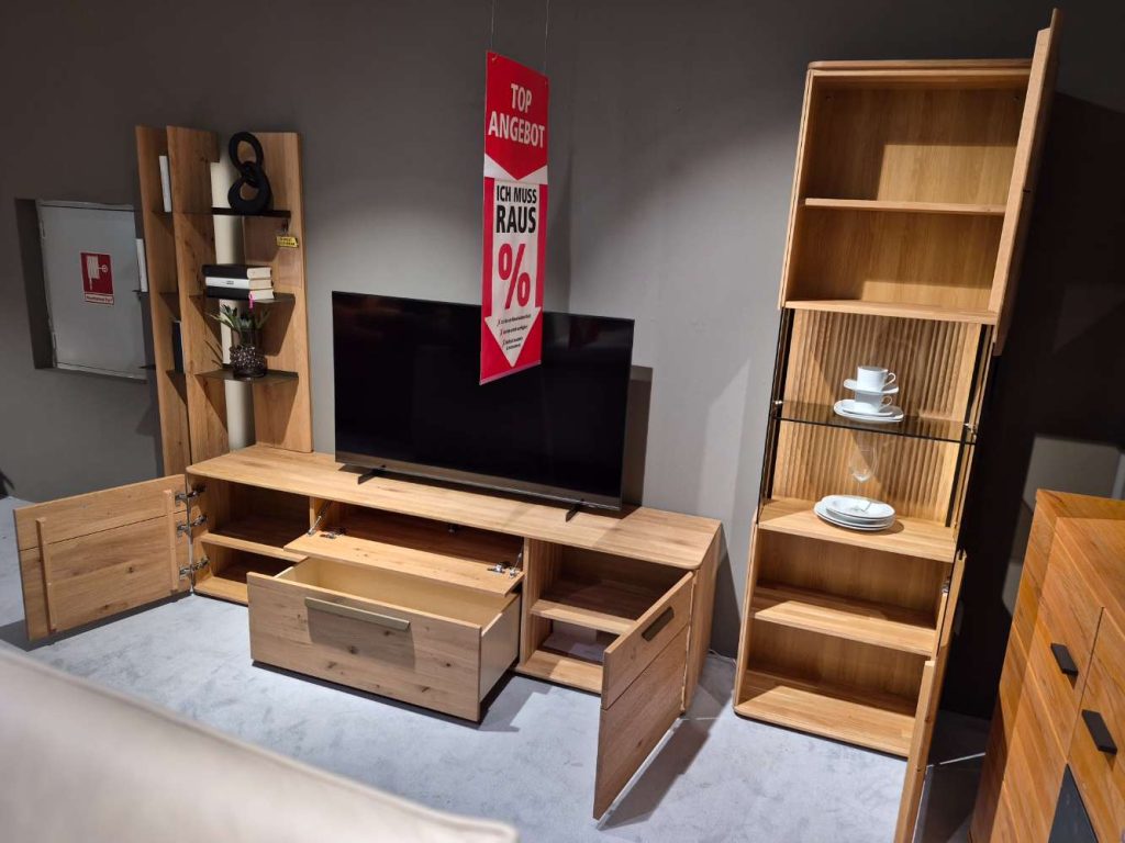 Bemerkung Dieses außergewöhnliche Möbelstück aus massivem Holz vereint Eleganz und Funktionalität in beeindruckender Weise. Mit den großzügigen Maßen von circa 333,8 cm in der Breite, 207 cm in der Höhe und 45,2 cm in der Tiefe bietet es ausreichend Platz, um seine Umgebung stilvoll zu dominieren, ohne dabei erdrückend zu wirken. Die naturbelassene Holzoptik strahlt Wärme und zeitlose Ästhetik aus, die jeden Raum sofort aufwertet. Der besondere Clou dieses Möbelstücks ist der integrierte 2-Kanal-Funk-Dimmer. Mit ihm lässt sich die Beleuchtung individuell anpassen und schafft so je nach Stimmung und Bedarf eine passende Atmosphäre. Ob für das heimische Wohnzimmer oder als Highlight in einem Ausstellungsraum, dieses Möbelstück ist so viel mehr als nur ein funktioneller Gebrauchsgegenstand. Es ist ein Statement für guten Geschmack und Qualität. Die Verwendung als Ausstellungsware zeugt von seiner Exklusivität und dem hohen Anspruch an Design und Verarbeitung.