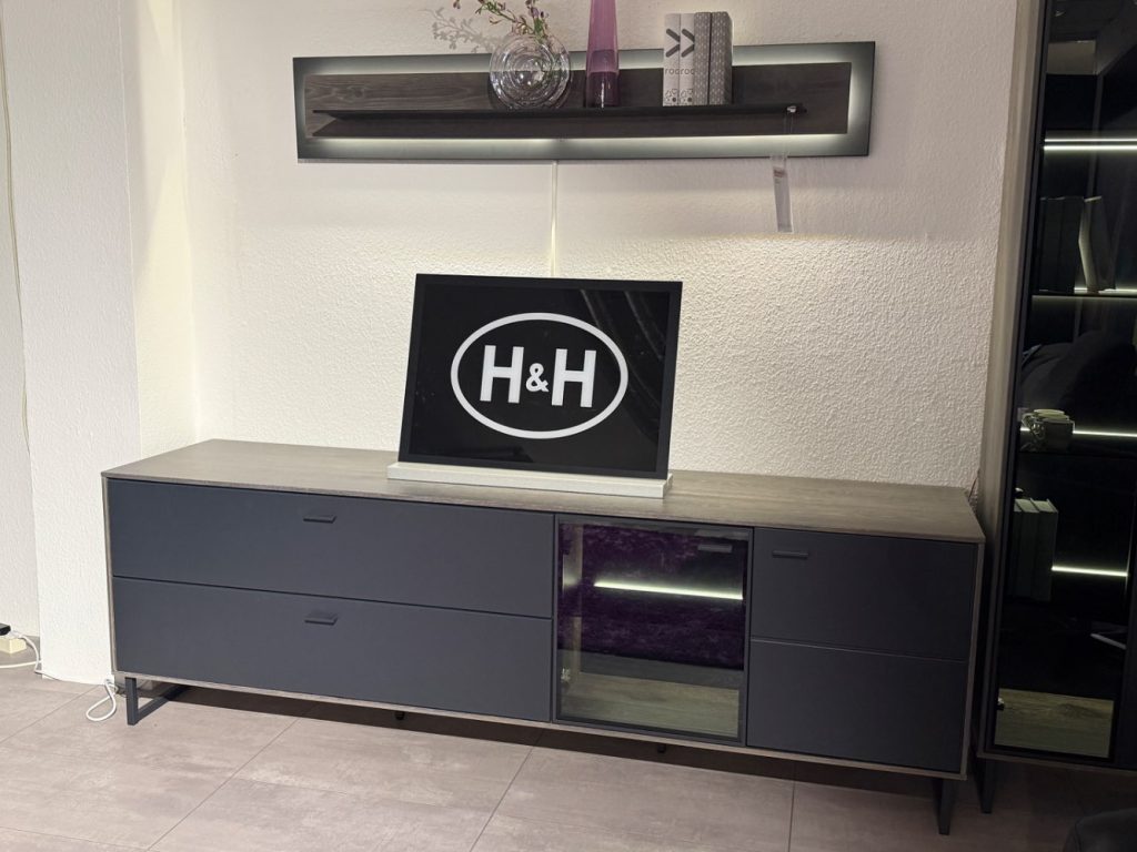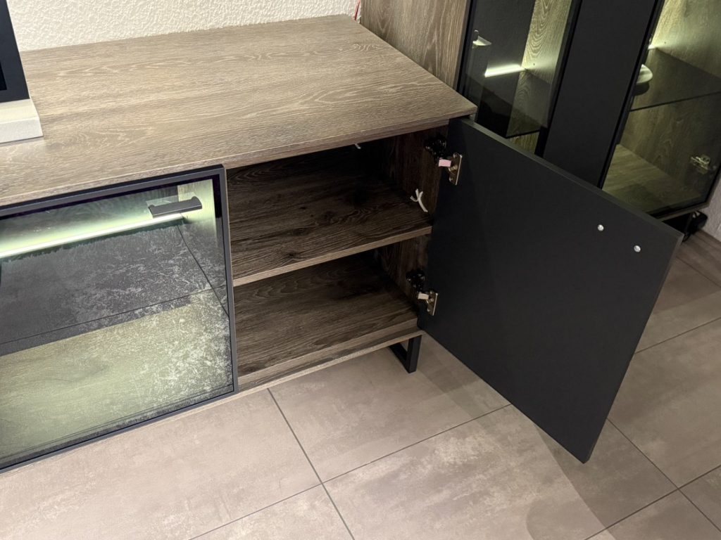 Die Metallfüße in elegantem Anthrazit verleihen dem Möbelstück eine erhabene Stabilität und betonen seine moderne Silhouette. Ein besonderes Highlight dieser Wohnwand ist die integrierte Beleuchtung, die Ihre Lieblingsstücke effektvoll in Szene setzt. Für zusätzlichen Komfort sorgt die mitgelieferte Funkfernbedienung, mit der Sie die Beleuchtung mit Leichtigkeit steuern können. Die Venezia Wohnwand ist ein Meisterwerk der Handwerkskunst und Funktionalität, das Ihr Zuhause in ein modernes und zugleich behagliches Ambiente verwandelt.