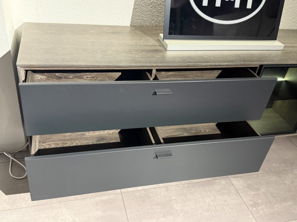 BemerkungEntdecken Sie die raffinierte Eleganz des Venezia Wohnwand-Systems von MCA. Diese Ausstellungware vereint zeitloses Design mit modernen Akzenten und bringt Luxus in Ihr Wohnzimmer. Der Korpus in edlem Vulcano Eiche Furnier harmoniert perfekt mit den stilvoll in Softblack lackierten Fronten, was einen spannenden Kontrast schafft und gleichzeitig eine warme und einladende Atmosphäre erzeugt. Das großzügige Maß von ca. 321x185x50 cm bietet reichlich Stauraum und präsentiert Ihre Wohnaccessoires auf stilvolle Weise.