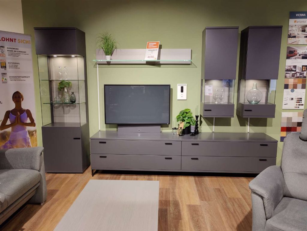 BemerkungEntdecken Sie die elegante Wohnwand Vienna von RMW, ein exquisites Möbelstück, das Ihre Wohnatmosphäre revolutionieren wird. In edlem Schiefergrau präsentiert sich dieses hochwertige Qualitätsmöbel mit einer harmonisch kontrastierenden Rückwand im Feinschliff Bianco. Die 345 x 219 x 49 cm große Wohnwand ist aus robusten Holzwerkstoffen gefertigt und zeichnet sich durch eine makellose, lackierte Oberfläche aus, die ihr einen modernen, stilvollen Look verleiht. Als Ausstellungsware bietet sie nicht nur höchste Qualität Made in Germany, sondern auch ein bemerkenswertes Finish, das jeden Raum aufwertet.