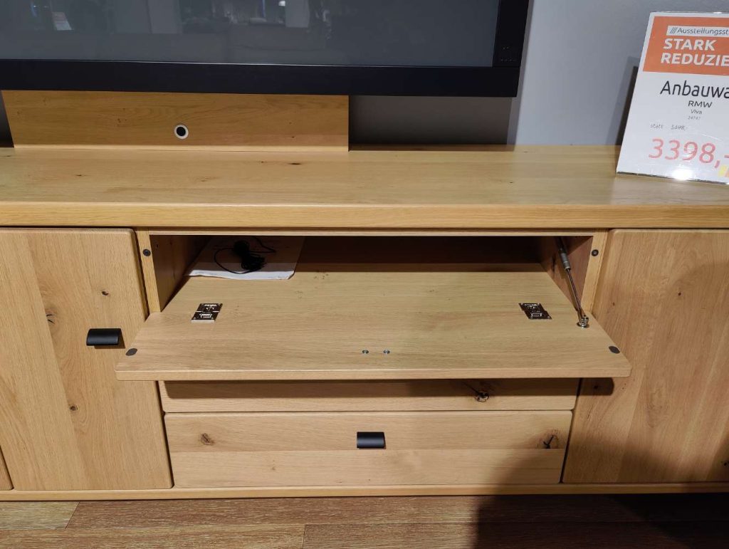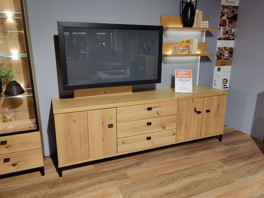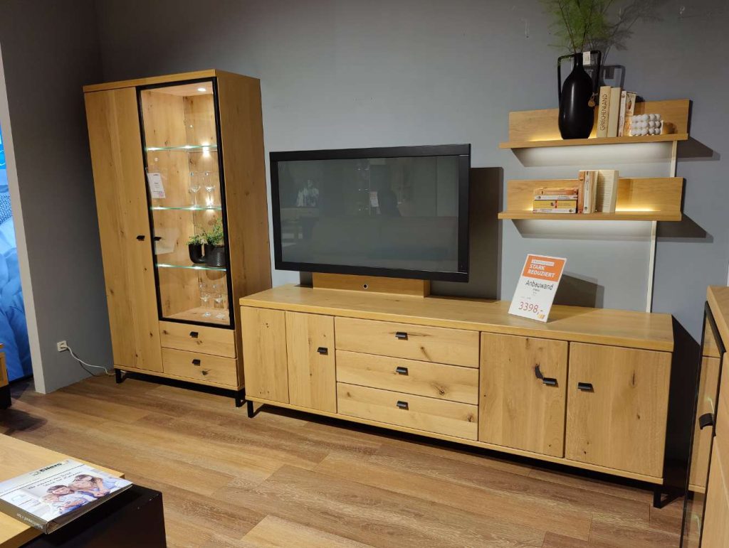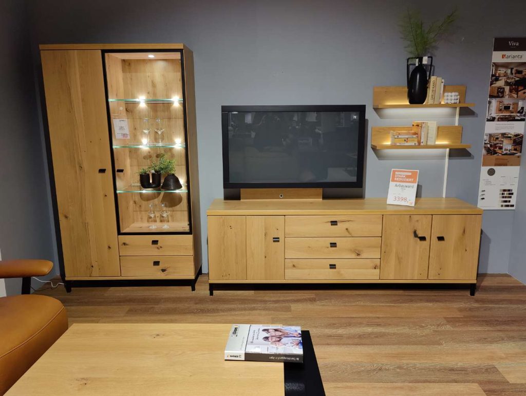 BemerkungDie Wohnwand Viva in elegantem Asteiche-Look ist ein Meisterwerk des deutschen Herstellers RMW und verkörpert höchste Qualitätsstandards. Gefertigt aus massivem Holz, beeindruckt dieses Möbelstück durch seine natürliche Ausstrahlung und Langlebigkeit. Mit einer großzügigen Maße von 330 x 194 x 49 cm bietet es ausreichend Platz für Ihre Wohnbedürfnisse. Die integrierte Beleuchtung setzt Ihre Lieblingsstücke perfekt in Szene, während die im Lieferumfang enthaltene Funkfernbedienung eine komfortable Handhabung ermöglicht. Ein TV-Halter sorgt dafür, dass Ihr Fernseher bestens positioniert ist und das Gesamtbild der Wohnwand harmonisch ergänzt. Als Ausstellungsware bietet diese Wohnwand eine exklusive und stilvolle Lösung für Ihr Wohnzimmer, die durch ihre Verarbeitung und Funktionalität besticht.