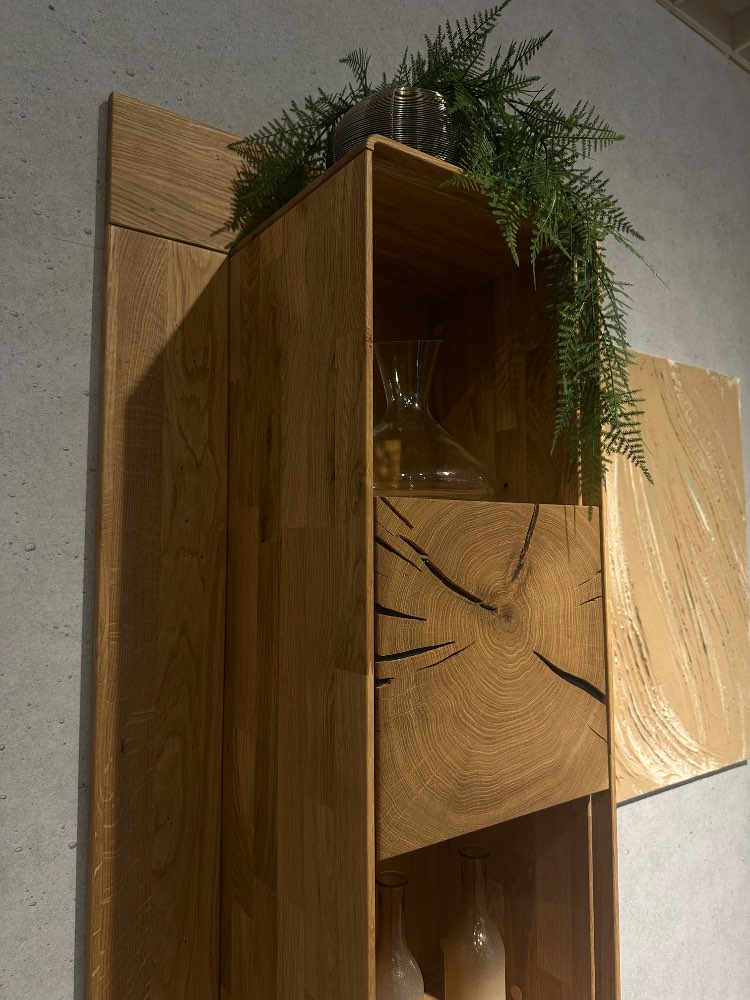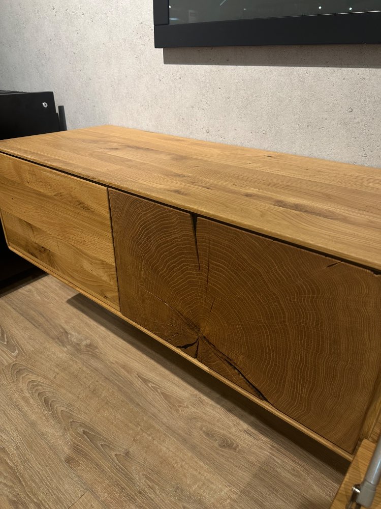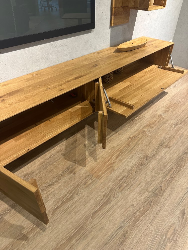 BemerkungSchöne Massivholz Wohnwand bestehend aus: TV-Element ca. B/H/T 220x31x40 cm und Wandboard ca. B/H/T 47x121x30 cm in Wildeiche massiv geölt, ohne Dekoration!