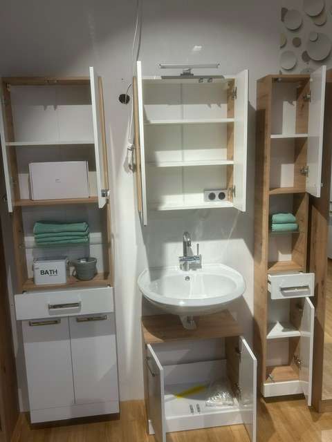Bemerkung Pelipal Badezimmer-Set in weiß matt und artisan Eiche bestehend aus: Maße (B/H/T): - Waschbeckenunterschrank: 55/56/33 cm (noch 1x neu im Lager) - Spiegelschrank: 55/70/20 cm, inkl. Beleuchtung - Hochschrank 1: 50/188,5/20 cm (noch 1x neu im Lager) - Hochschrank 2: 25/188,5/20 cm OHNE Waschbecken OHNE Armatur