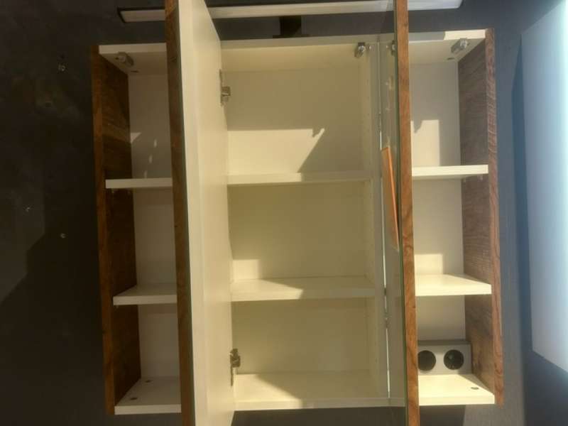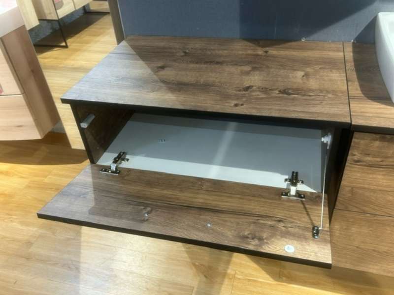 Bemerkung Badezimmer-Set in Ribbeck Eiche bestehend aus: Maße (B/H/T): - Waschbeckenunterschrank: 71/51/44 cm mit zwei Schüben - Unterschrank: 71/27,5/44 cm mit 1 Klappe - Waschbecken: Keramik - Spiegelschrank: 75/70/20 cm inkl. LED-Beleuchtung mit Soft-Close-System Ohne Armatur Ausstellungsstück