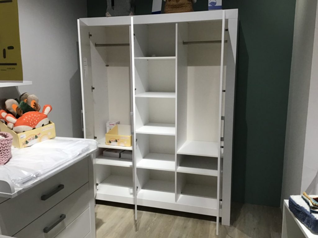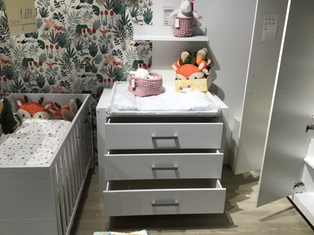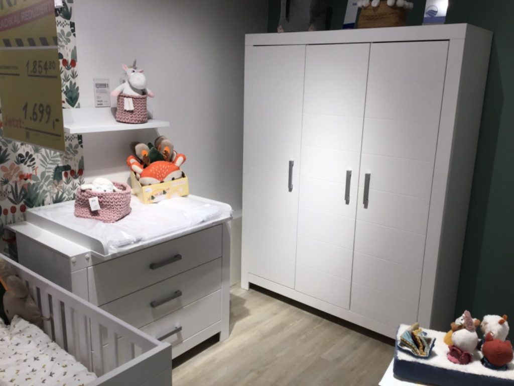 MaßeBett ca. 145 x 75,8 x 79,9 cm, Umbauseiten ca. 139 x 1,8 x 18,4 cm, Wiegfunktionsset ca. 75,8 x 3,2 x 8 cm, Kommode ca. 110 x 91,9 x 55,3 cm, Wickelaufsatz ca. 110 x 2,2 (9,5) x 78,1 cm, Wandboard ca. 70 x 11,5 x 19,8 cm, Kleiderschrank ca. 156,8 x 205,3 x 55,3 cm