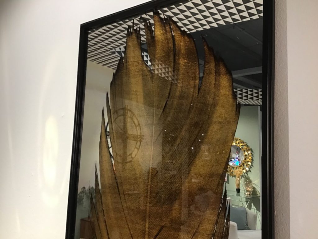 Glasscheibe mit Motiv Feder gold / schwarz, Rahmen Eisen schwarz