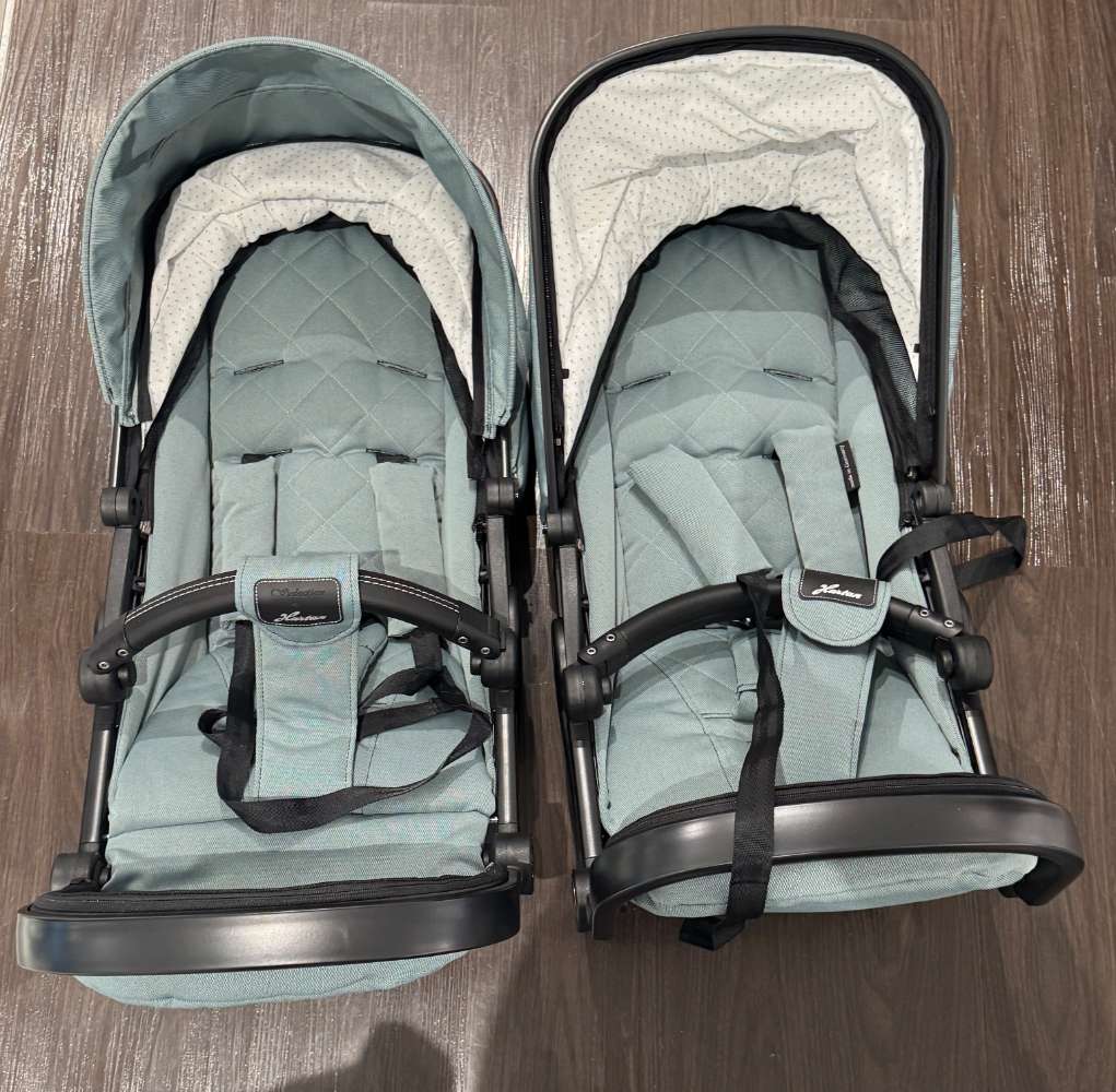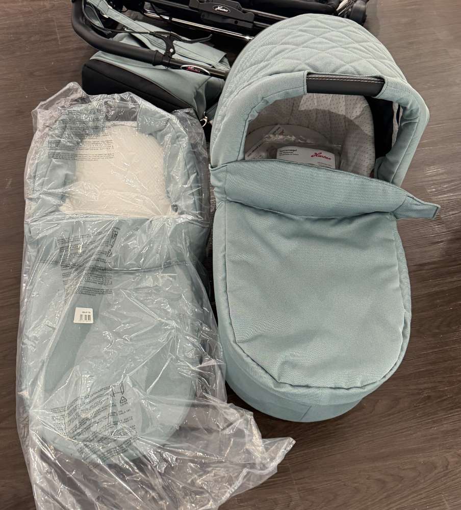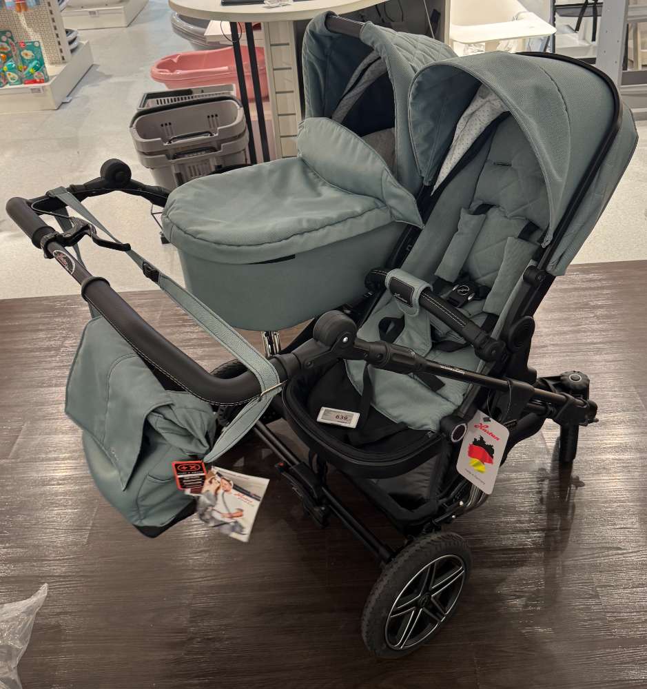 Bemerkung Der Two Select in der eleganten Farbe Jade bietet Ihnen eine umfassende Lösung für ihren Zwillings Babytransport und setzt dabei auf stilvolle Akzente. Als Ausstellungsstück von Hartan überzeugt dieses Modell mit einer durchdachten Ausstattung, die auf die Bedürfnisse moderner Eltern zugeschnitten ist. Dank der Maße von 79/114/86 und der variablen Einsatzmöglichkeiten erweist sich der Two Select als idealer Begleiter für Zwillinge aber auch für Geschwister. Besonders hervorzuheben sind das Gestell mit Adapter für Babyschalen sowie die beiden im Lieferumfang enthaltenen Sportsitze und Babywannen, die maximale Flexibilität bieten. Für zusätzlichen Komfort sorgen die starke, einstellbare Federung und die robusten Kunststoffräder, die auf jedem Untergrund für eine sanfte Fahrt sorgen. Die Handbremse gewährleistet dabei immer die nötige Sicherheit. Praktische Extras wie eine Wickeltasche, ein Sonnensegel und ein Regenverdeck machen diesen Kinderwagen besonders alltagstauglich und schützen Ihre Kinder zuverlässig vor Wind und Wetter. Der Two Select ist somit die perfekte Wahl für alle, die Wert auf Funktionalität und Stil legen.