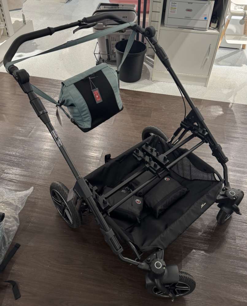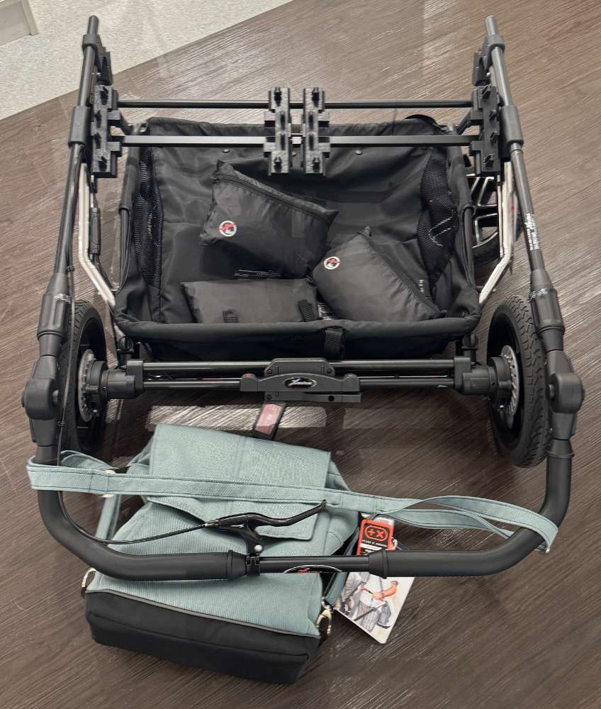 Gestell inkl. Adapter für Babyschale, 2x Sportsitz, 2x Babywanne, Wickeltasche, Sonnensegel, Regenverdeck, Handbremse, Kunststoffräder, stark einstellbare Federung,